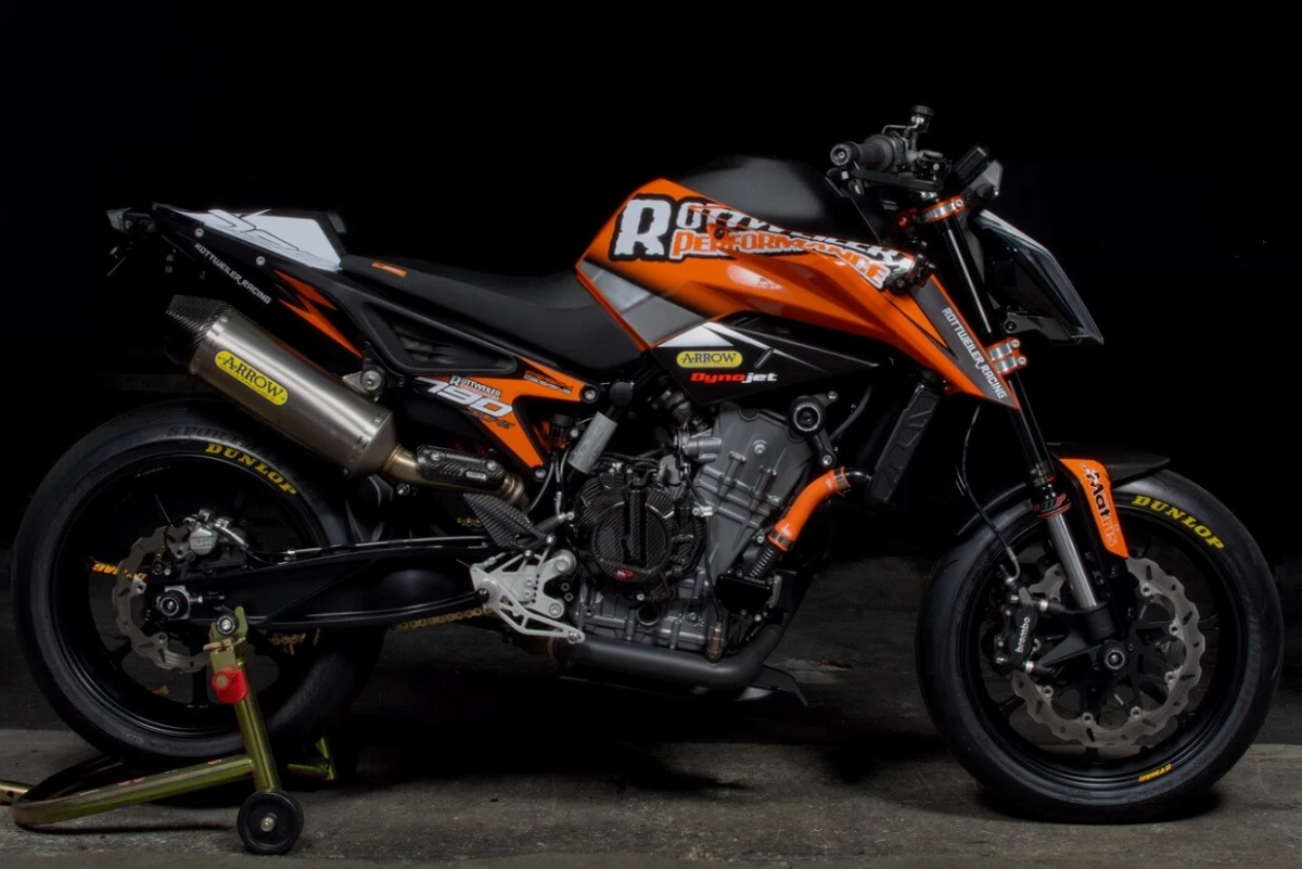 The engine actually has a great starting point, like many KTM’s, having power on tap that is smooth and potent is not a problem. But, we’re ROTTWEILER PERFORMANCE, there is NO WAY were leaving this area untouched! In fact, first thing we did with this bike (like every bike we get) is take off the tank and dive right into the intake system and see how we can breathe more life into this ½ size Duke. From there we go to the tuning, in order to have the best performance bike we can build, we need to start with the best stock platform we have. Typically, we will dive into ways to make the stock bike perform more efficiently, which has a side-effect of more power and cooler running engine temps. Next we dive into the exhaust systems as this is an easy way to add horsepower, trim weight, reduce high sitting weight (muffler) and of course, improve looks and sound.