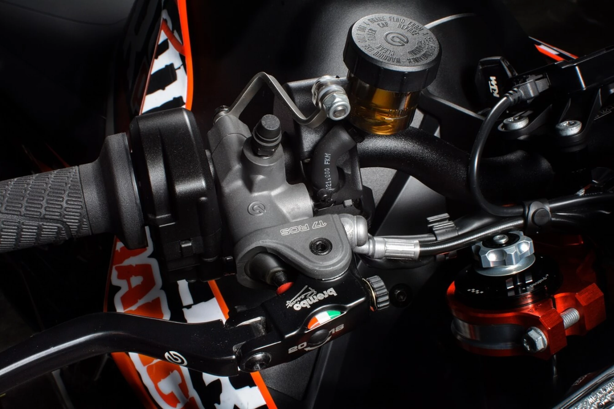 For the master-cylinder we swapped out the OEM unit with a BREMBO RCS 17mm Radial Master Cylinder which has an adjustable cam to tune your lever feel to your personal preference.