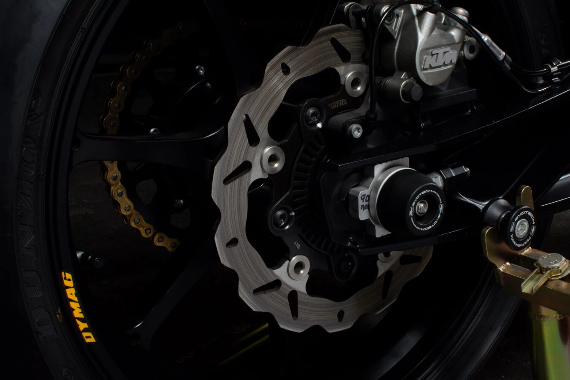 While we didn’t need to change out the chain and sprockets, we did so for the sake of reducing weight and getting a little more response from proper final drive ratios. Since the 790 Duke already comes with 520 chain and 16/41 sprockets, we were able to leave the countershaft sprocket stock, but still we swapped out the heavy OEM chain for a lightweight DID ZVMX Gold Chain, and did away with the stock steel 41t rear sprocket and installed a 42t Talon Aluminum Sprocket. This combination allowed us to both remove weight and perk up the acceleration.