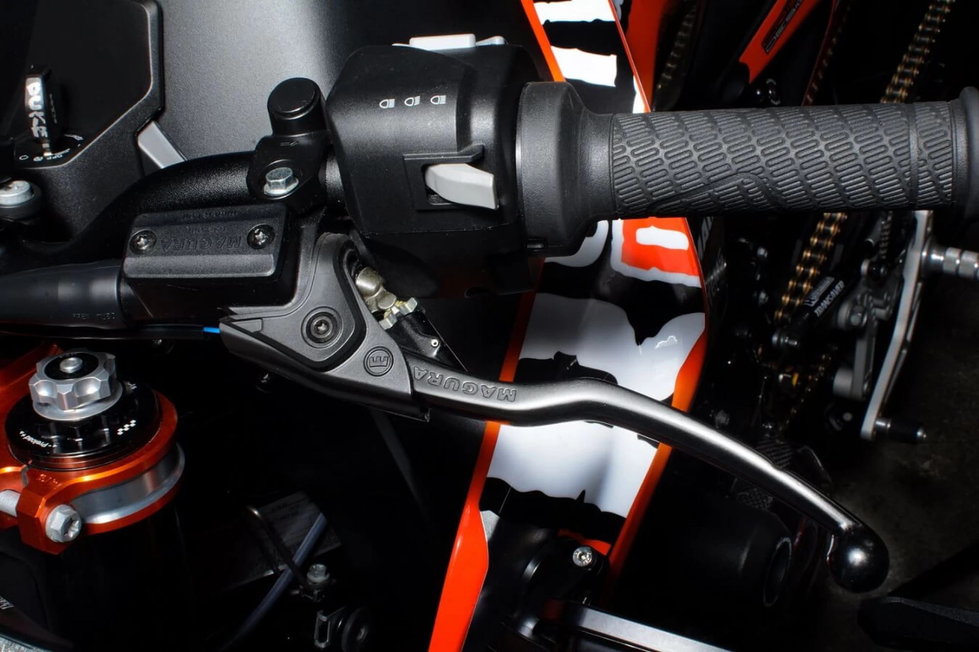 Flex from the front end can leave a wandering and imprecise feel both at corner entrance and holding line mid-corner. We for one, don’t think a wandering scalpel is remotely safe. Luckily KTM has a solution for this directly from their POWERPARTS catalog with a full Billet Triple Clamp kit, which not only looks drastically looks better, but increases rigidity for better handling and improved rider feedback.